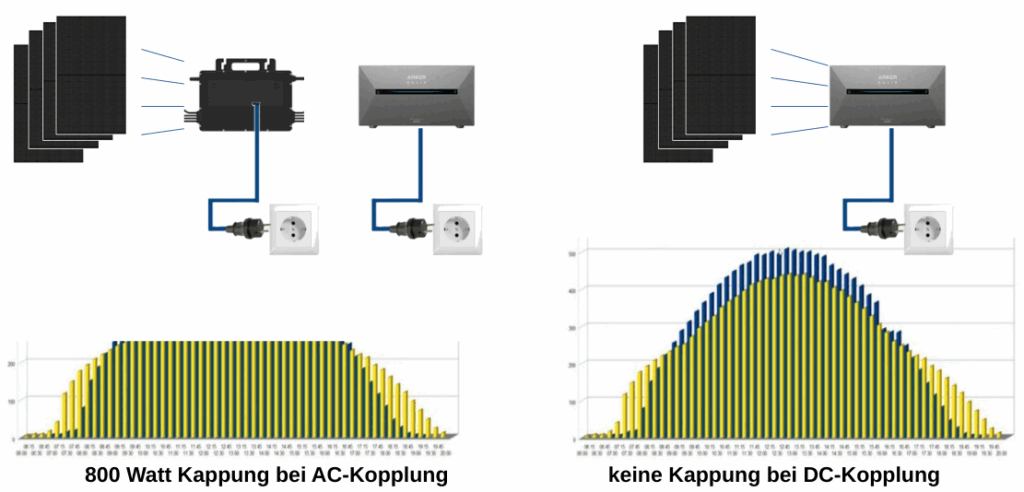 • DC-gekoppelte Speicher haben zwei fette Vorteile: Du sparst den extra Wechselrichter, weil die Solarmodule direkt an den Speicher gehen. Und mega-wichtig: Bei mehr als zwei Modulen muss dein Balkonkraftwerk normgerecht auf 800 VA begrenzt sein – Mittags wird dann viel Solarpotenzial einfach nicht erst erzeugt, die Spitze wird einfach gekappt (Clipping!). Ein DC-Speicher puffert diesen Überschuss und gibt später maximal 800 VA ab. Viele Balkonisten geben aber “volle Kraft voraus” ohne Begrenzung – nicht normgerecht, aber verlockend. Es gibt auch Hybrid-Modelle, wo du den vorhandenen Wechselrichter direkt in die Batterie steckst und so >800 VA machst.