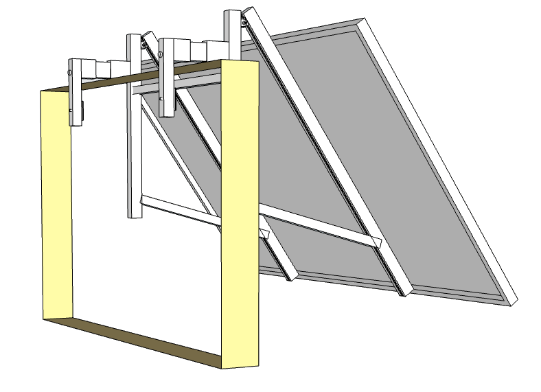 Dieses System "Balkon Schräg" für verstellbar aufgeständerte Montage an Balkonen mit einer Stärke von 70 bis 170mm wird eingehängt wie ein Blumenkasten und dann festgeklemmt.