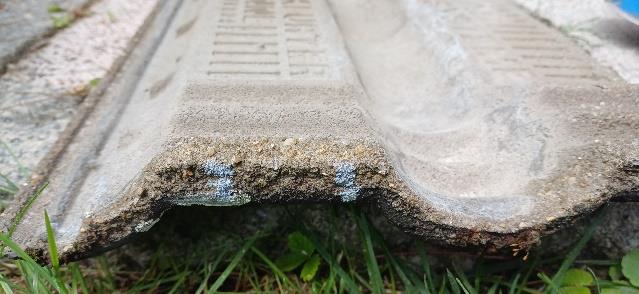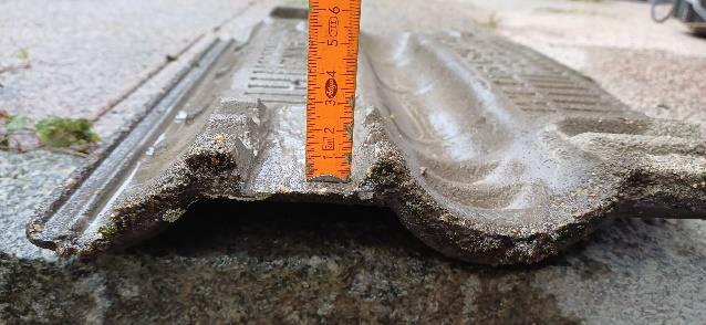 Links die Dachpfanne mit Markierung, rechts nach dem Ausklinken mit einem Winkelschleifer.