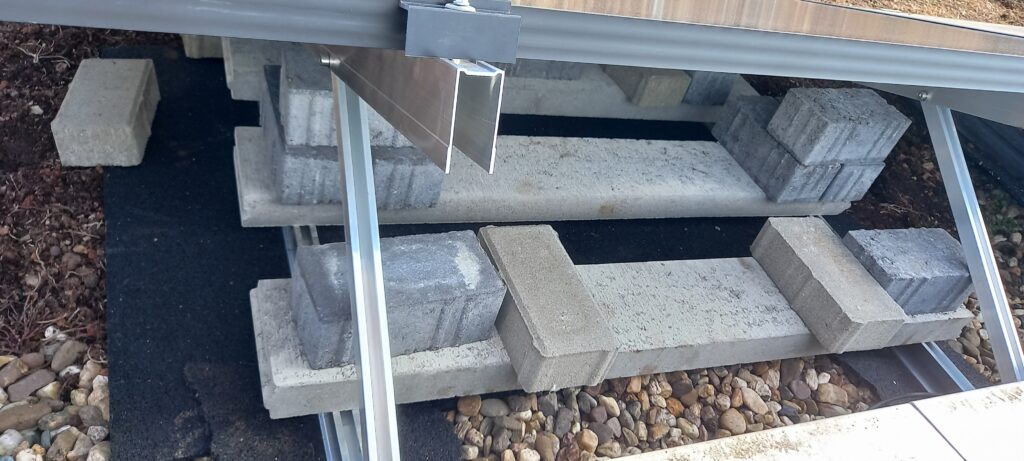 Er schreibt dazu: “Auf unserem Flachdach lege ich immer Bauschutzmatten drunter. Kosten [..] ca 10 Euro. Dann die Träger, dann 1 m lange Randsteine quer auf beide Träger. Die wiegen je nach Höhe entweder 18 kg oder 28 kg. Kosten: 2 bis 4 Euro. Danach ist alles schon sehr stabil. Darauf lege ich dann Pflastersteine. Gewicht: 2.5 bis 3.5 kg. Pflastersteine sind deutlich leichter auf das Dach zu schaffen. Aus meiner Sicht ist das wahnsinnig stabil so. Außerdem habe alle Panele noch jeweils mit einer Kette festgemacht… Die Bilder zeigen einen Zwischenstand, damit man die Randsteine unten noch erkennen kann. Danach kann man natürlich so viele Pflastersteine auflegen, wie man will.”